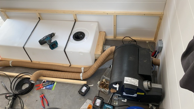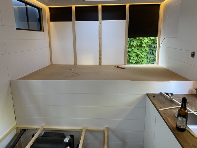 Das Bett ist bereits gebaut, die Wände und die Decke sind verkleidet, und auch das Gestell des Sofas steht. Wasser- und Abwasserleitungen sind vorbereitet, und selbst im Stauraum geht es stetig voran.